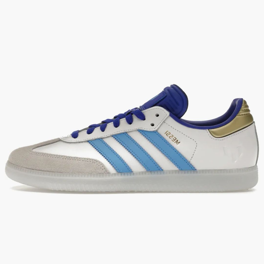 Discover the essence of Argentine passion with the Adidas Samba Indoor Lionel Messi. These indoor football shoes are a stylish homage to the national colors of the football star. The exquisite material combination made of white leather and gray suede forms a classic look. The famous three strips in light blue adorn the side, while Messi's name shines in shimmering gold. The tongue and shoelaces present themselves strongly blue, refined by Messi's logo on the tongue and heel. The design is rounded off by a golden heel collar and a translucent sole. A perfect choice for everyone who wants to combine elegance and sports spirit. February 20, 2024.Authenticity Guaranteed