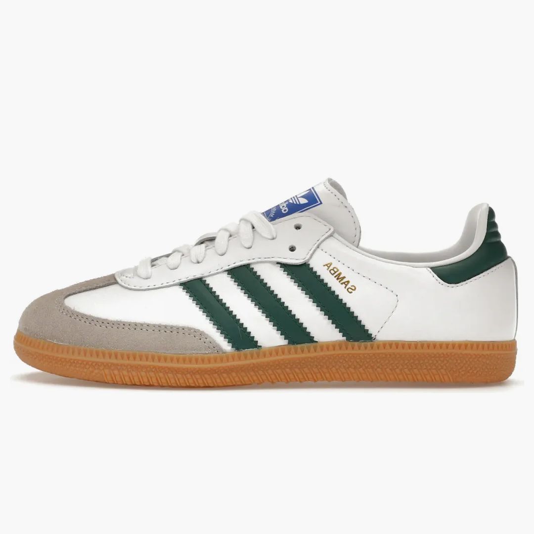 Experience retro charm with the Adidas Samba OG Collegiate Green. This new edition of an iconic design impresses with a balanced mix of color made of Collegiate Green and Cloud White, which wakes nostalgic associations. Originally designed as a soccer shoe, this model of the Samba OG series offers a slim outer and minimalist upholstery. The golden shine of the 'Samba' branding on the tongue elegantly stands out from the lively green of the large jagged 3-strip and the heel tab. The use of suede on the toe cap in a gentle beige tone creates a harmonious contrast that rounds off the look without disturbing the overall picture. Ideal for everyone who wants to combine classic style with a fresh, sporty accent. Published on March 1, 2024 and a must for sneaker lovers.Authenticity Guaranteed