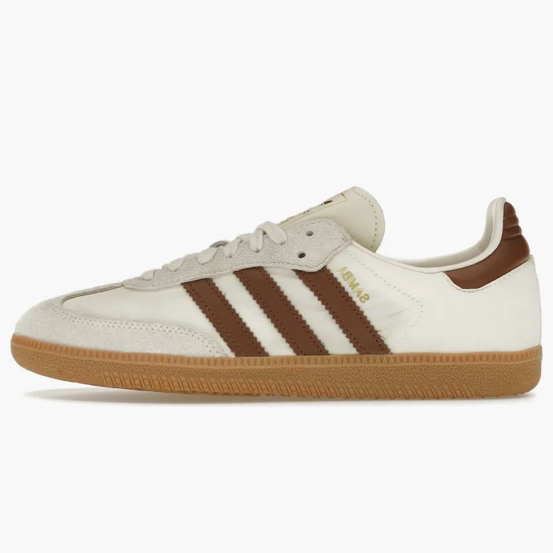 An reinterpreted a classic among the sneakers: The Adidas Samba OG Cream White Preloved Brown combines retro appeal with modern accents. The upper material combines smooth leather, textile and soft suede in a harmoniously coordinated color. Cream-white tones form the basis, while accents in Preloved Brown highlight the iconic 3 strips and the heel area. The special details, such as silver brand logos on the tongue and the word 'Samba' on the side area, give the shoe a contemporary touch. The design is rounded off by a high -contrast rubber sole, which perfectly complements the classic look. A sneaker for everyone who loves something special.Authenticity Guaranteed