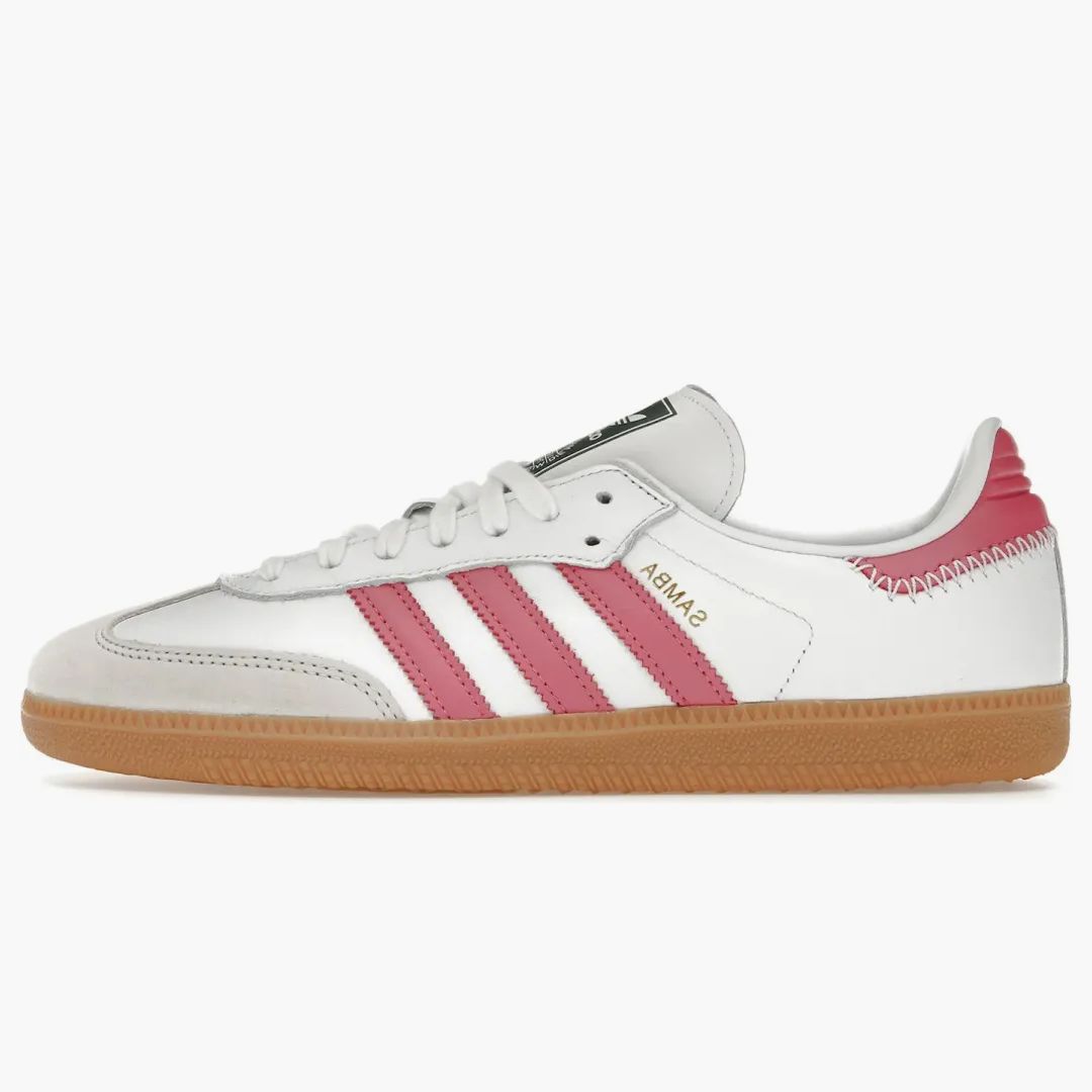 The Adidas Samba OG Rose Tone for women brings classic style to everyday life. With an elegant combination of suede and leather in white, the shoe shines through its rose tone accents on the iconic three strips and the heel cap. The collegiate green accents on the tongue set a striking contrast, while the golden samba logo and the rubber sole round off the aesthetics. Created in 1949, the Adidas Samba was designed as a soccer shoe for hard, icy soils and is now a timeless classic in fashionable, coveted colors. The Rose Tone Edition was released perfect for style -conscious trendsers on June 1, 2024.Authenticity Guaranteed