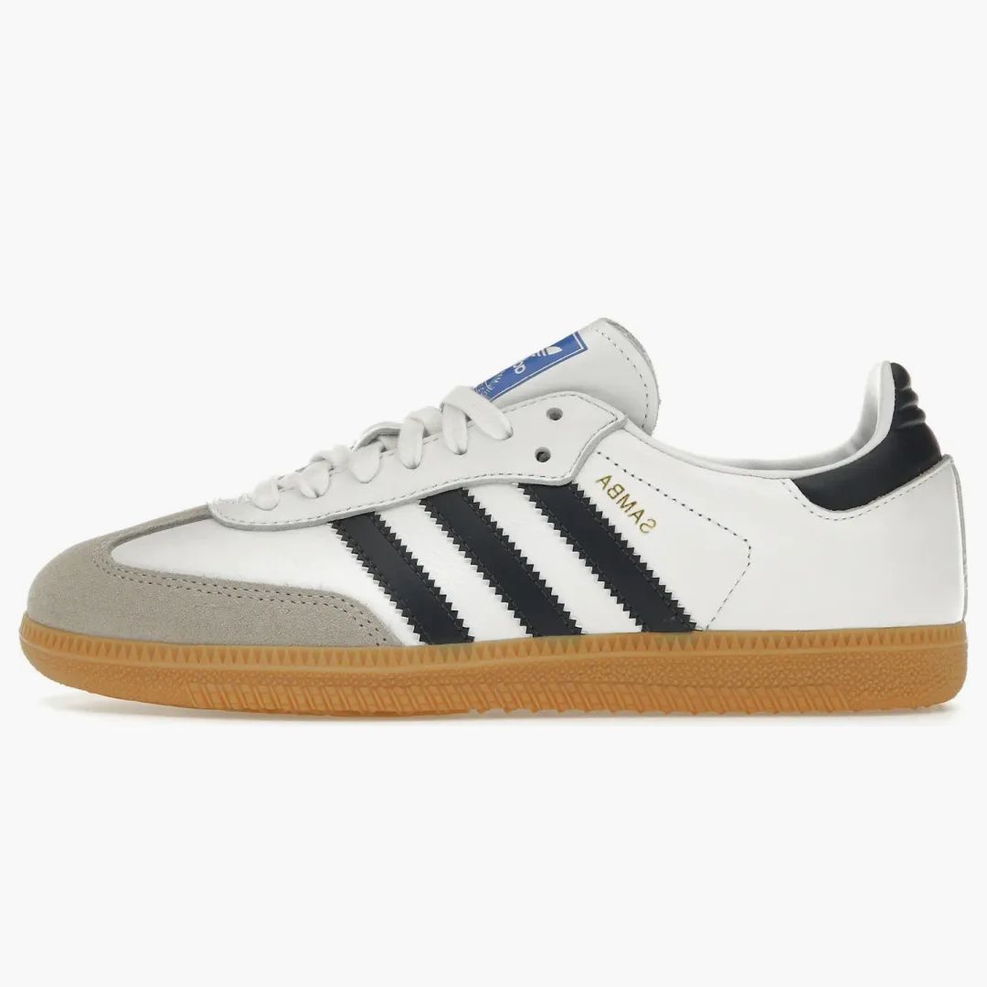 The Adidas Samba OG White Night Indigo Gum combines nostalgic design with modern accents. Originally designed as a soccer shoe, he has developed into an iconic lifestyle piece. The main color Core White is supplemented by details in Night Indigo and a chic TAN. The characteristic 3-stripes in Night Indigo adorn the sides, while the T-shaped overlay structure made of suede of the shoe tip gives retro charm. Rounded off with a robust rubber outsole and striking leather accents, this sneaker embodies both inheritance and style. Perfect for those who appreciate classic design and still want a contemporary touch.Authenticity Guaranteed