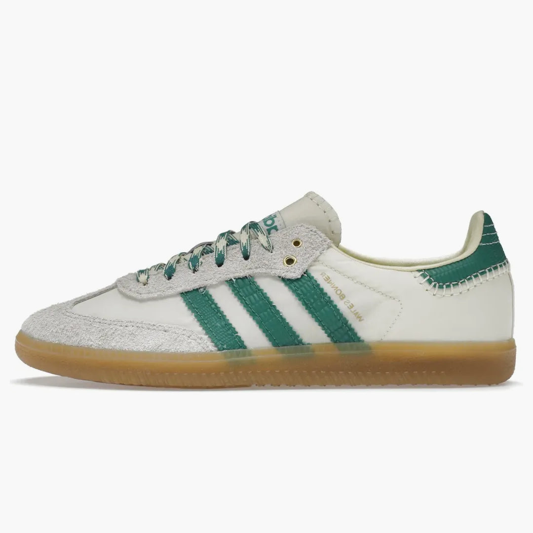 The Adidas Samba Wales Bonner Cream Green are a stylish fusion of classical and modern. The appealing, smooth leather look in cream is supplemented by hairy suede covers at the footpan. In addition, there is the characteristic green structure of the three stripes and an unmistakable heel insert. With an artistic, loose seam around the tongue and heel, an individual feeling of wear is created. The design is rounded off by a timeless outsole in rubber look. This unique edition brings a breath of fresh air to the sneaker classic, which was released in June 2022.Authenticity Guaranteed