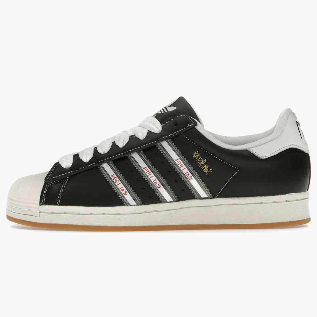 The Adidas Superstar Korn 30th Anniversary Sneaker combine music and style in a unique design. This collaboration brings the iconic superstar design of Adidas together with elements that celebrate the band's 30th anniversary. The sneaker captivates with a leather upper mix in white, black and gold, supplemented by embossed patterns that are inspired by the styles of the band. The grain logo on the heel, combined with the adidas logo on the tongue, turns the shoe into a must-have for fans and collectors. The golden 'superstar' details are particularly worth mentioning over the 3-strip, which is the lettering. 1994. The striking shell cap offers additional robustness, while the rubber sole ensures grip. A homage in timeless design for music and fashion enthusiasts alike.Authenticity Guaranteed