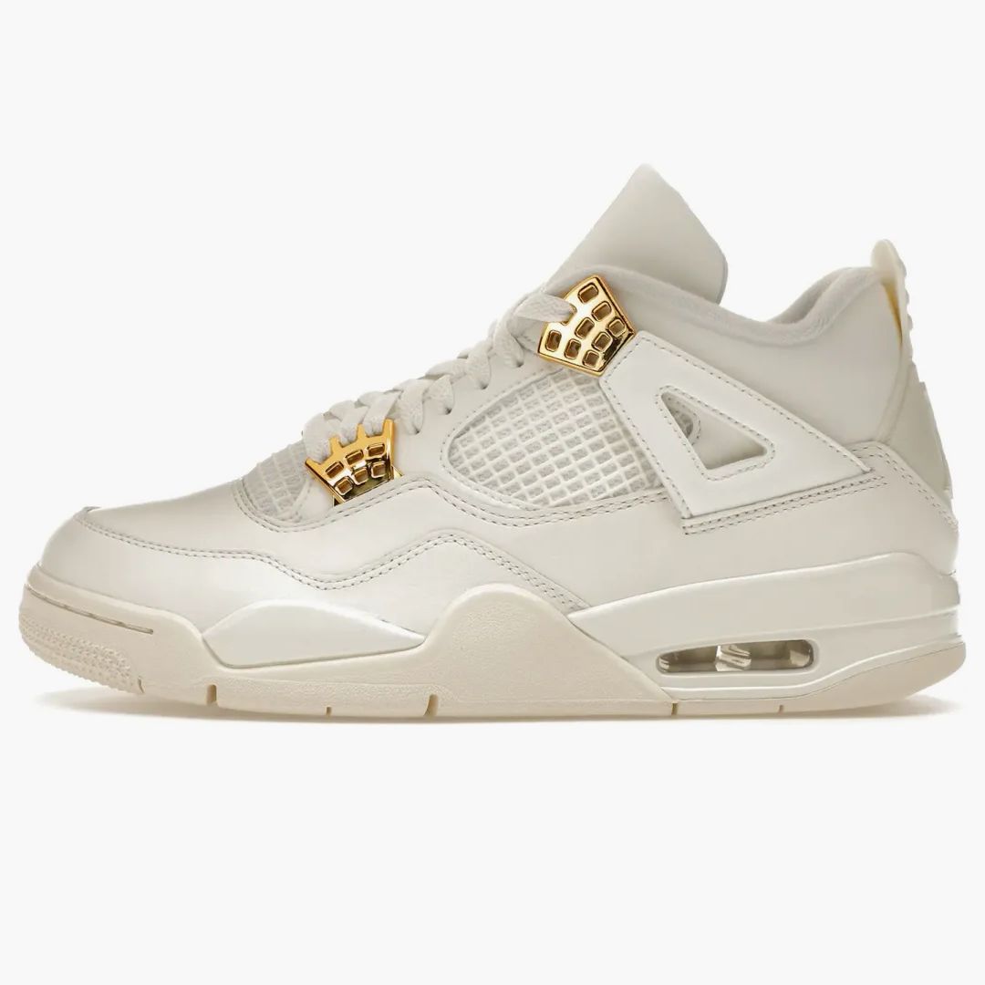The Jordan 4 Retro Metallic Gold for women shines in an elegant off-white tone and stands out through golden accents. The smooth leather upper material combined with a sail sole forms the perfect basis on which the four metallic-gold eyelets shine. These stylish accents are located on the side of the lace -up and give the design a luxurious note. Breathable mesh in the side area ensures fresh comfort, while the visible air unit in the heel ensures easy damping. Signature details, such as the Jumpman logo on the tongue and heel, round off the look. An additional golden jumpman under the shoe offers a special eye -catcher. Published on March 9, 2024, this sneaker is a must for style -conscious women.Authenticity Guaranteed