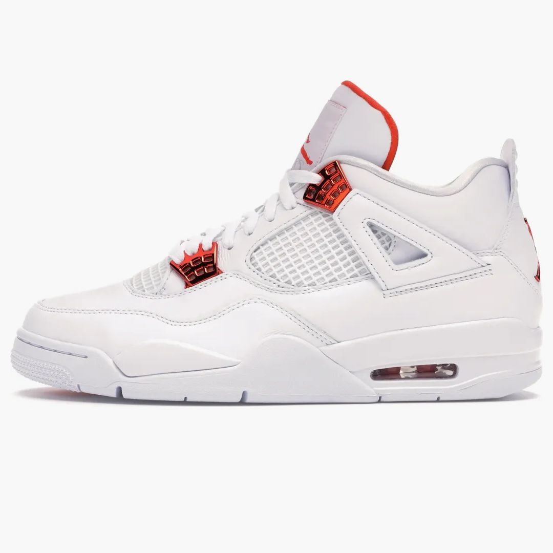 The Jordan 4 Retro Metallic Orange Sneakers are a tribute to an original color scheme of the Jordan brand. Inspired by classic designs of the Air Jordan 1 Metallic series, this sneaker is characterized by its elegant, white leather upper. Completed with metallic orange details on the eyelets and a Jumpman logo on the heel, the overall picture is rounded off with a white sole and an orange air unit. Published in May 2020, these sneakers are a must for every sneaker lover who is on timeless classics with a modern twist.Authenticity Guaranteed