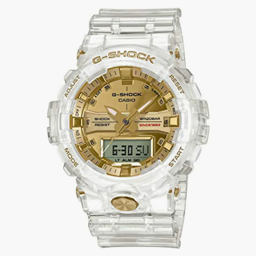 The Casio G-Shock Glacier Gold collection with the GA835-7A inspires for the 35th anniversary. This watch combines robust style with functionality. The shockproof silicone housing predestines it for adventurers, while waterproofing up to 200 meters is ideal for swimming and diving adventures. Scratch -resistant and durable, the clock withstands the challenges of everyday life. The digital display offers practical functions such as stopwatch, countdown timer and several alarms. A luxurious gold dial paired with a comfortable silicone bracelet complete the timeless design of this watch.Authenticity Guaranteed