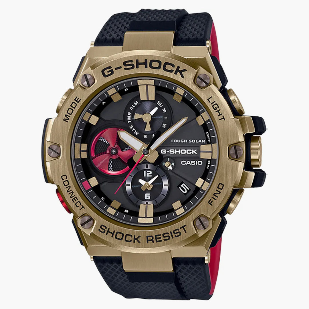 The Casio G-Shock GStB100RH-1A is a combination of stainless steel and robust resin, which embodies both strength and sophistication. The golden yellow shell and the dial with red accents give the watch a sporty elegance, inspired by the team colors of the celebrated basketball player Rui Hachimura. A highlight is the rotating disc digit mechanism that visualizes the innovative time and battery level. Bluetooth connectivity and solar-powered energy ensure precise and long-lasting use. This watch, which is characterized by a unique design and symbolic details, was published in August 2020 and impresses with advanced design and technology.Authenticity Guaranteed
