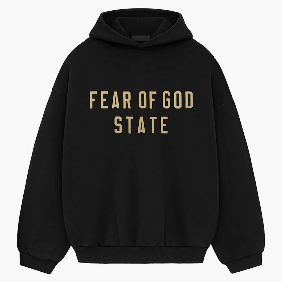 The Fear of God Essentials Fleece Hoodie combines luxury and casual streetwear style in black. This high-quality sweatshirt of the renowned brand from Los Angeles impresses with robust 480 GSM fleece production, which ensures durability and form stability. The material mix of 80 % cotton and 20 % polyester offers extraordinary wearing comfort and a pleasantly soft fit. The striking 'Fear of God State' prints are striking on the chest in a sporty varsity style. The design with overlapping shoulders, long sleeves and ribbed details on the hem and cuffs rounds off the relaxed look. Additional details such as the casual hood and hidden side pockets make the hoodie a perfect companion for every day. A timeless piece of clothing that should not be missing in any wardrobe.Authenticity Guaranteed