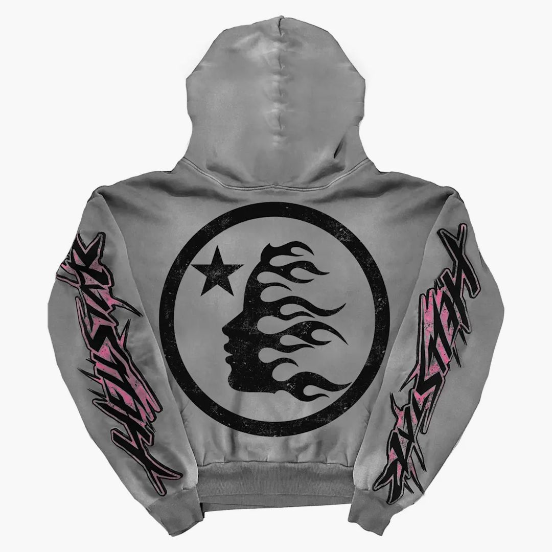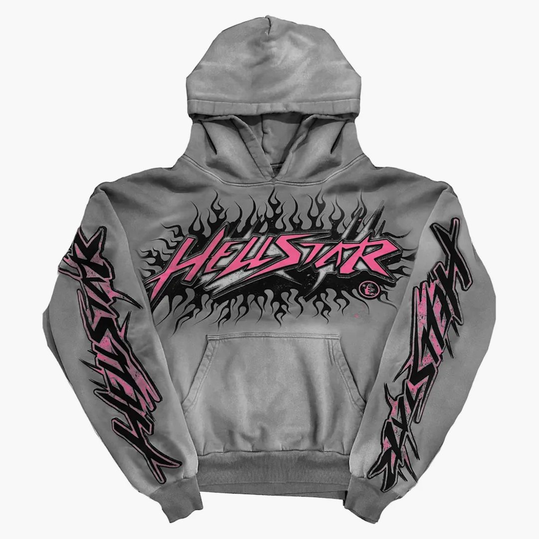 The Hellstar Future Flame Hoodie Gray combines futuristic design with comfort. Made 80% of cotton and 20% polyester, it offers a high -quality material composition. The gray coloring with subtle, weathered areas gives the hoodie a registered look. The lively brand logo in a strong pink on the front is particularly striking, which is rounded off by black flames and other accents. The sleeves also bear the brand name, while the iconic, circular logo adorns the back. Published on August 19, 2023, this hoodie is not only a fashionable statement, but also a sign of personal style.Authenticity Guaranteed