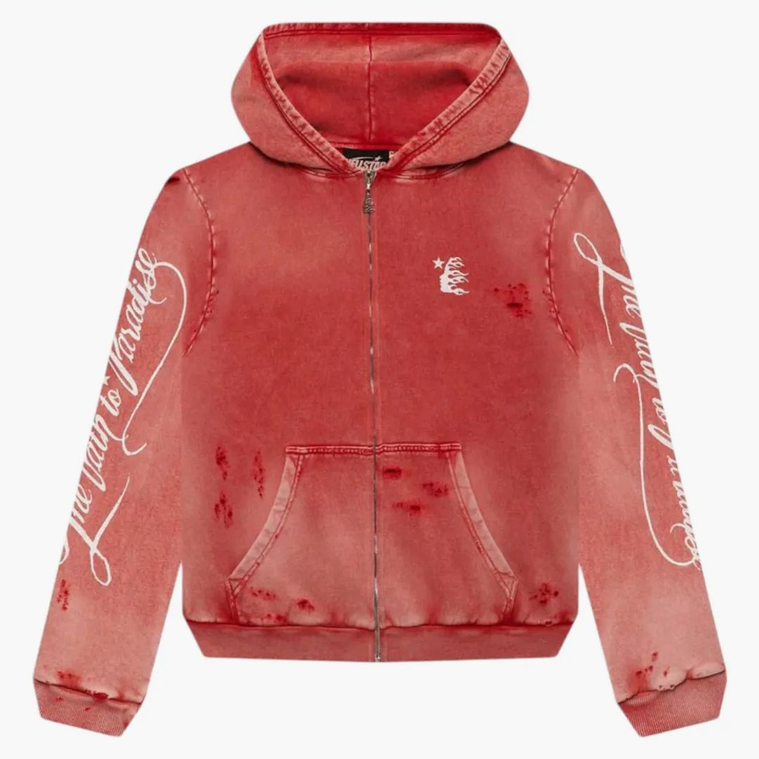 The Hellstar Path to Paradise Zip-Up Red Jacket is the ideal companion for everyone who appreciates style and comfort. The intensive red tone gives every outfit that certain extra and ensures an unforgettable appearance. The high -quality workmanship not only guarantees longevity, but also a high level of comfort. The practical zipper enables easy dressing and undressing, while the casual cut ensures freedom of movement. Perfect for both a relaxed stroll through the city and for special occasions. Let yourself be inspired by this exclusive jacket and set a fashionable statement.Authenticity Guaranteed