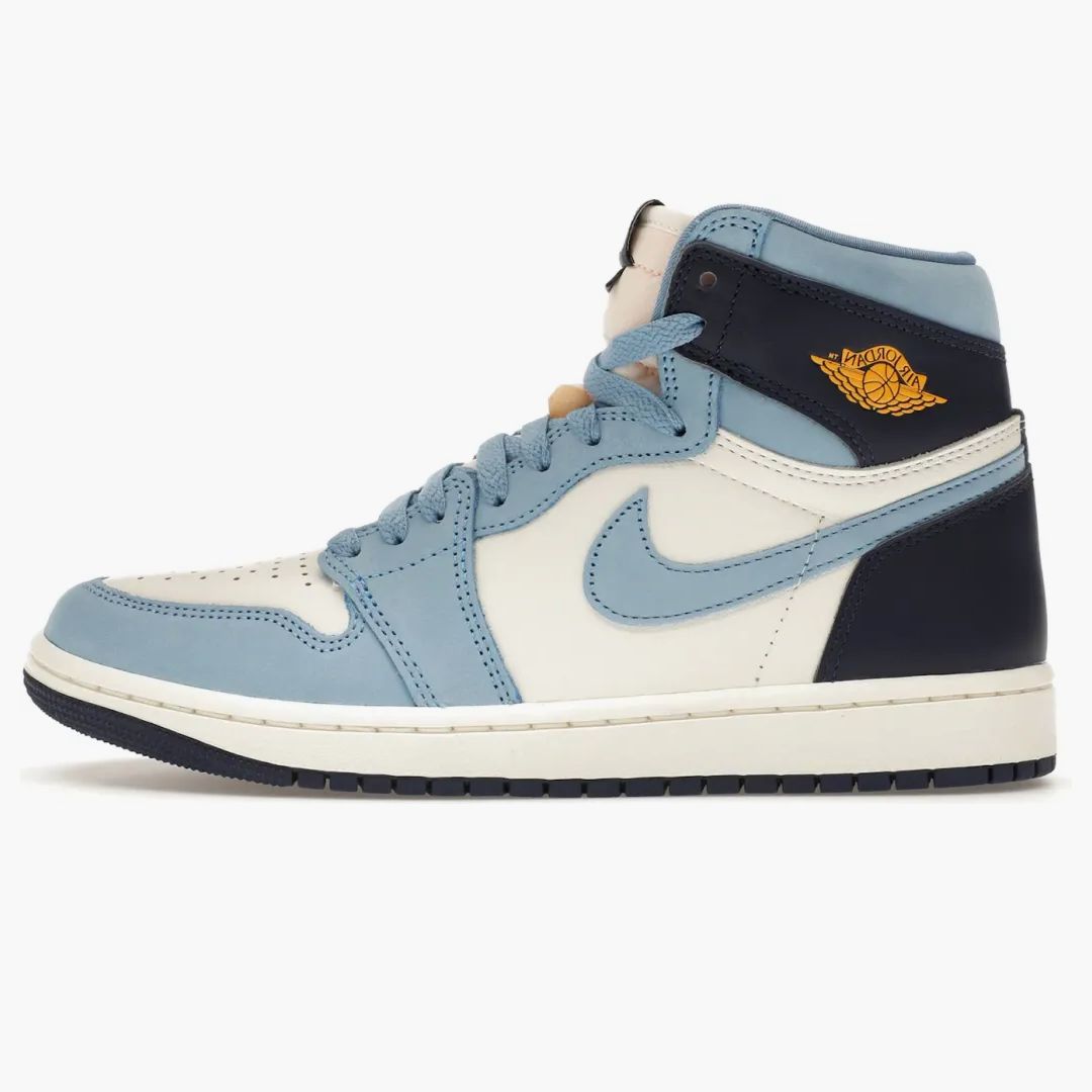 Discover the exclusive Jordan 1 High OG First in Flight (Women's) - a real highlight in the sneaker world. This execution recognizes the legendary achievements of the Wright brothers and Michael Jordans at the University of North Carolina. The sneaker captivates with high-quality leather with an elegant sail foundation, which is supplemented by contrasting overlays in University Blue and Tief Midnight Navy. The iconic Swoosh in University Blue and that Air Jordan Wings logo in University Gold give the shoe additional sophistication. The retro flair of the sneaker comes from the Sail-Ton, while the padded collar offers the necessary comfort. A nike air-sole embedded ensures excellent damping with every step. A must-have for fashion and sports enthusiasts alike.Authenticity Guaranteed