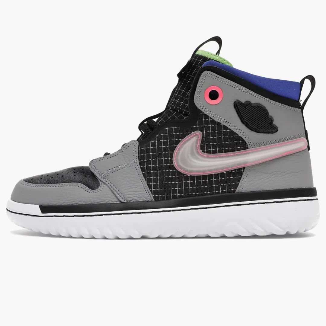 Experience the Jordan 1 High React Black Particle Gray, which combines iconic style with modern comfort. The shoe impresses with a combination of black and participation gray leather, which is supplemented by a grid-like nylon pattern. Accents in Ghost Green and Racer Blue give the design a dynamic look. The Nike React damping ensures a comfortable fit.