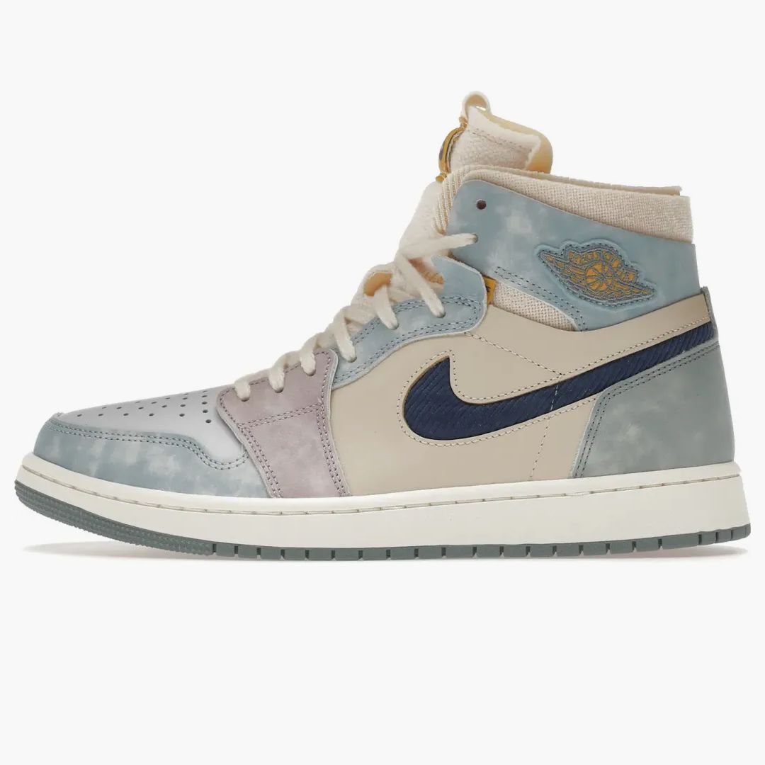 The Jordan 1 High Zoom Air CMFT Celestine Blue brings refreshing sky colors and noble pale gold into the iconic design. The combination of rauled leather, leather and knitting materials gives this model an attractive texture. The sky blue color adorns the ankle area, the toe cap, the lace -up and the heel, while the front sheet is held in light leather, perfectly tailored to the covers made of blue suede. Brand characteristics set accents: the cut out dark blue Kord-Swoosh, a gold-colored Wings logo and a zoom air label on the tongue. Published for the first time in February 2022, this sneaker combines fashion and comfort in a unique way.Authenticity Guaranteed
