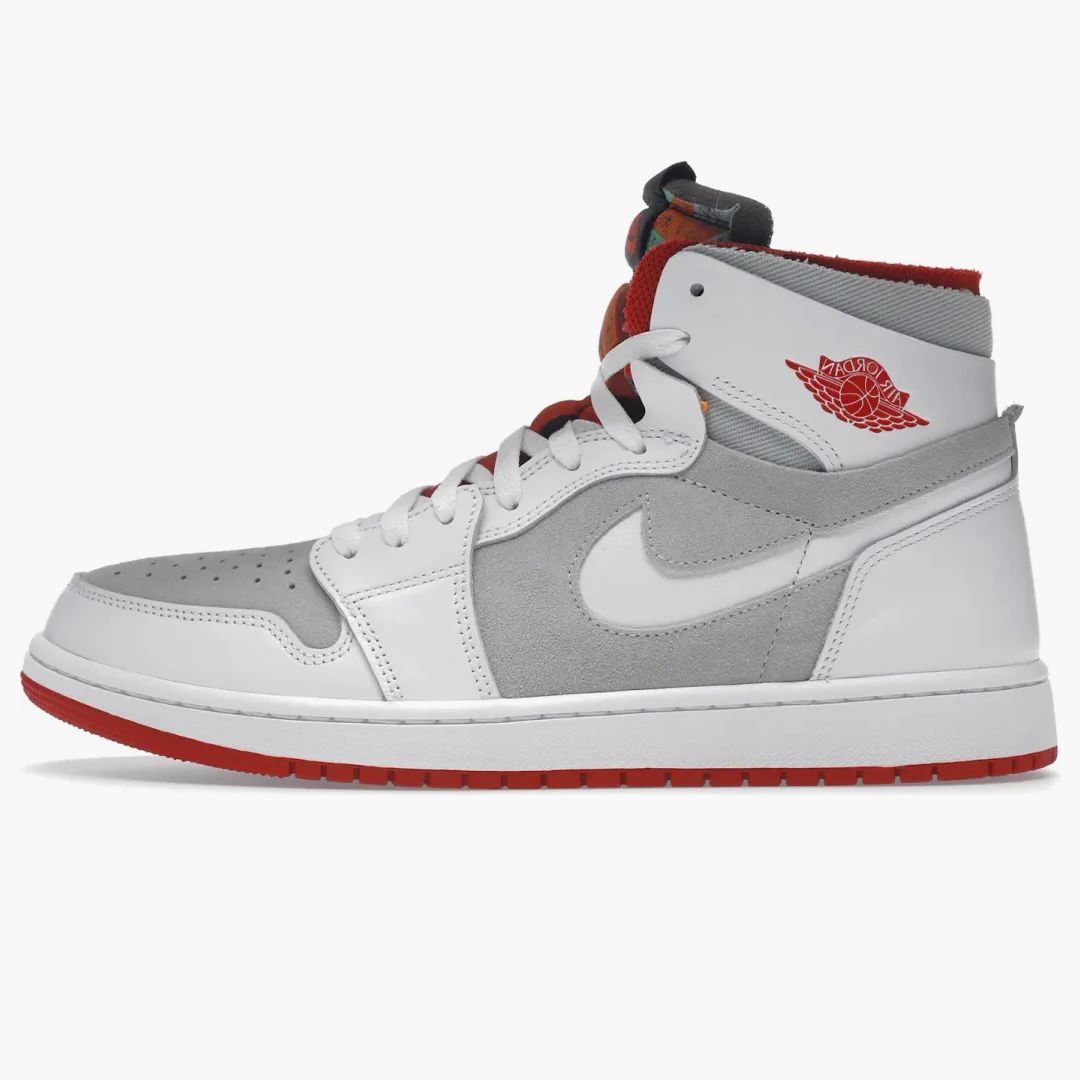 Discover the distinctive style of the Air Jordan 1 High Zoom Air cmft Hare, inspired by the iconic 'Hare' color. This High-Top model cleverly combines gray wild leather with white leather covers for a dynamic appearance. The deconstructed tongue and the red Jordan Wings logo and zoom Air logo use give the silhouette a modern touch. The design is rounded off by white laces, a white midsole and a contrasting red running sole. Available since August 10, 2022, this sneaker not only relies on design, but also on comfort.Authenticity Guaranteed