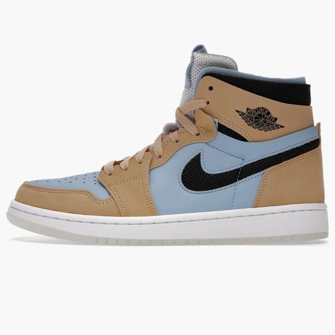 The Jordan 1 High Zoom Air CMFT Psychic Blue for women combines classic silhouette and modern coloring, which captivates with the striking blue supplemented with black, white and sesame. The robust leather structure promises durability, while Zoom Air technology in the midfoot area offers comfortable padding. The padded shaft and the tongue also ensure pleasant hold. The rubber outsole ensures the necessary grip, while perforations in the toe area optimize ventilation. Brand accents like the iconic Nike Swoosh and that Air Jordan Wings logo round off the design.