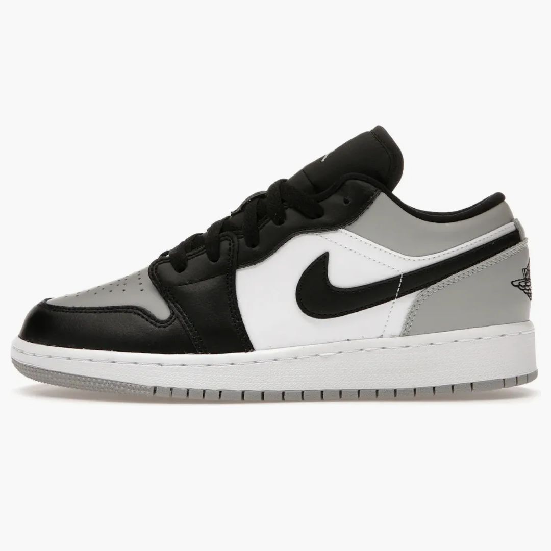 The Jordan 1 Low Shadow Toe (GS) impresses with its timeless design, ideal for young trendsetters. The combination of black, white and gray colors gives the sneaker an elegant look that is suitable for both everyday life and for light sporting activities. The sole in bright white supplemented by a gray strip, offers first -class comfort. High quality leather pieces shape the upper material, while the iconic Nike icon in black is enthroned on the side. This fashionable companion was first presented in December 2021 and has been a must for every shoe shelf since then.Authenticity Guaranteed