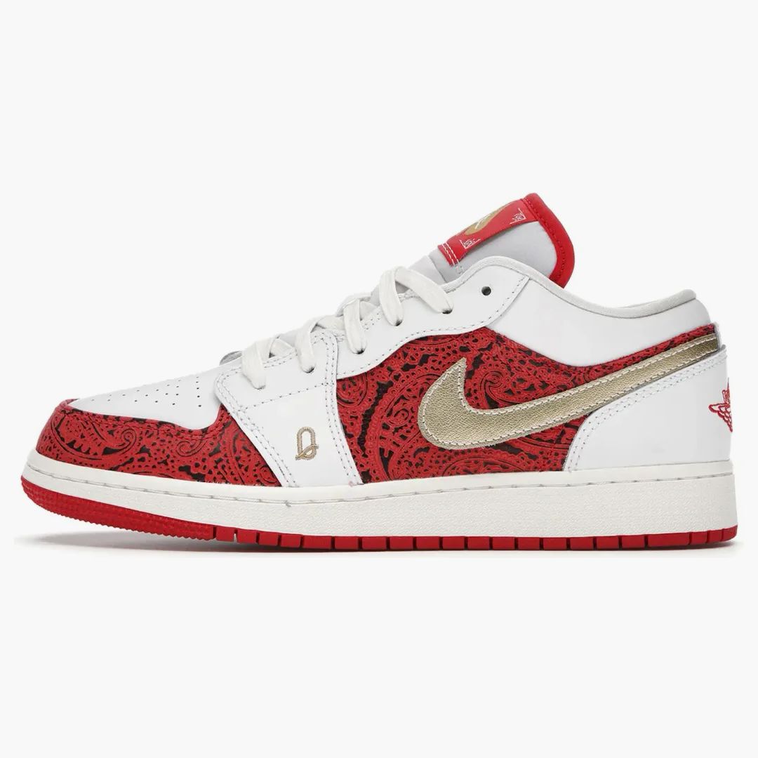 The Jordan 1 Low Spades (GS) combines style and functionality in an impressive color composition made of white, metallic gold, university-red and sail. The high -quality upper combines smooth leather with suede, which not only impresses optically but also functionally. Personalized details such as the embroidered Jordan Wings logo on the heel underline the market-typical character, while the generously padded midsole ensures comfortable wear. The rubber outsole gives stability and robust hold. A highlight is the silver metallic pik print on the tongue, which fits seamlessly into the spades card game topic. This uniquely designed shoe appeared in May 2021 especially in sizes for elementary school students.Authenticity Guaranteed