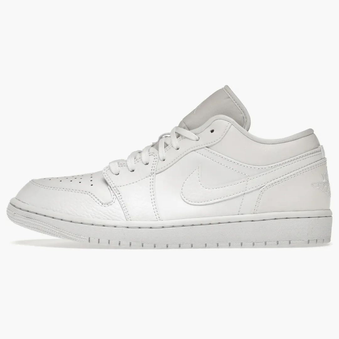 The Jordan 1 Low Triple White Tumbled Leather combines timeless elegance with a striking design. Inspired by the original Low-Top model from 1985, he presents himself in flawless white from head to toe. The combination of high-quality full-scorch and generous leather gives the shoe an impressive structure. The slightly padded nylon shoe collar offers additional wearing comfort, while the iconic jumpman logo adorns the tongue and the characteristic wing details come into its own on the heel area. A perfect choice for all those who want to be stylish.Authenticity Guaranteed