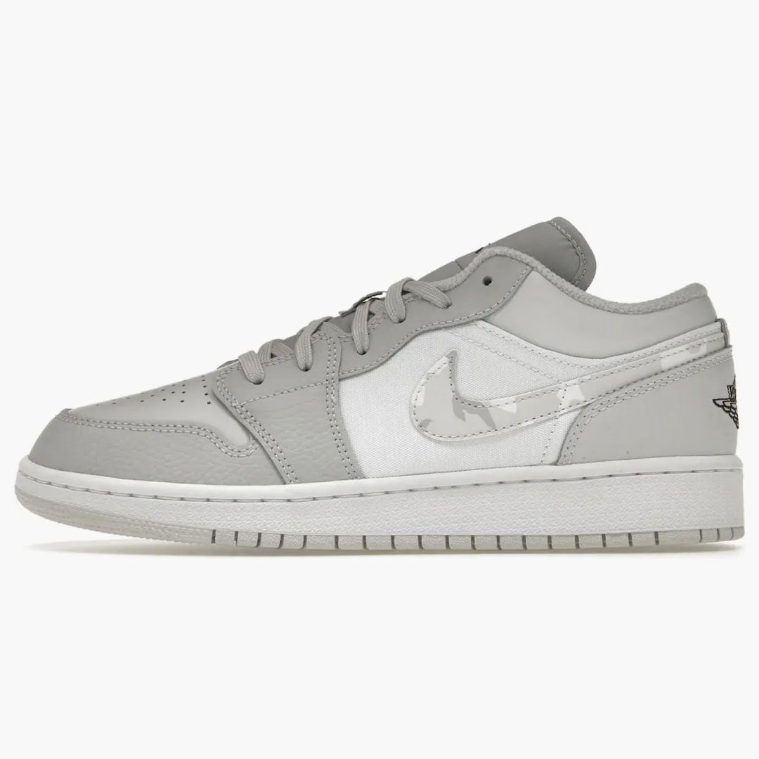 The Jordan 1 Low White Camo (GS) combines chic design with an iconic style. Three harmonious colors - gray, photon dust and white - determine the appearance of this sneaker. A beige sole complements the gray camouflage Swoosh, while Arctic Gray Parts adorn the white background. The look is rounded off with the black Jumpman logo on the tongue and a set gray laces. The famous Wings lettering adorns the back and gives the shoes a unique note. Originally intended as a sneaker for young trendsetters, this model combines sporty elegance with a touch of adventure lust.Authenticity Guaranteed