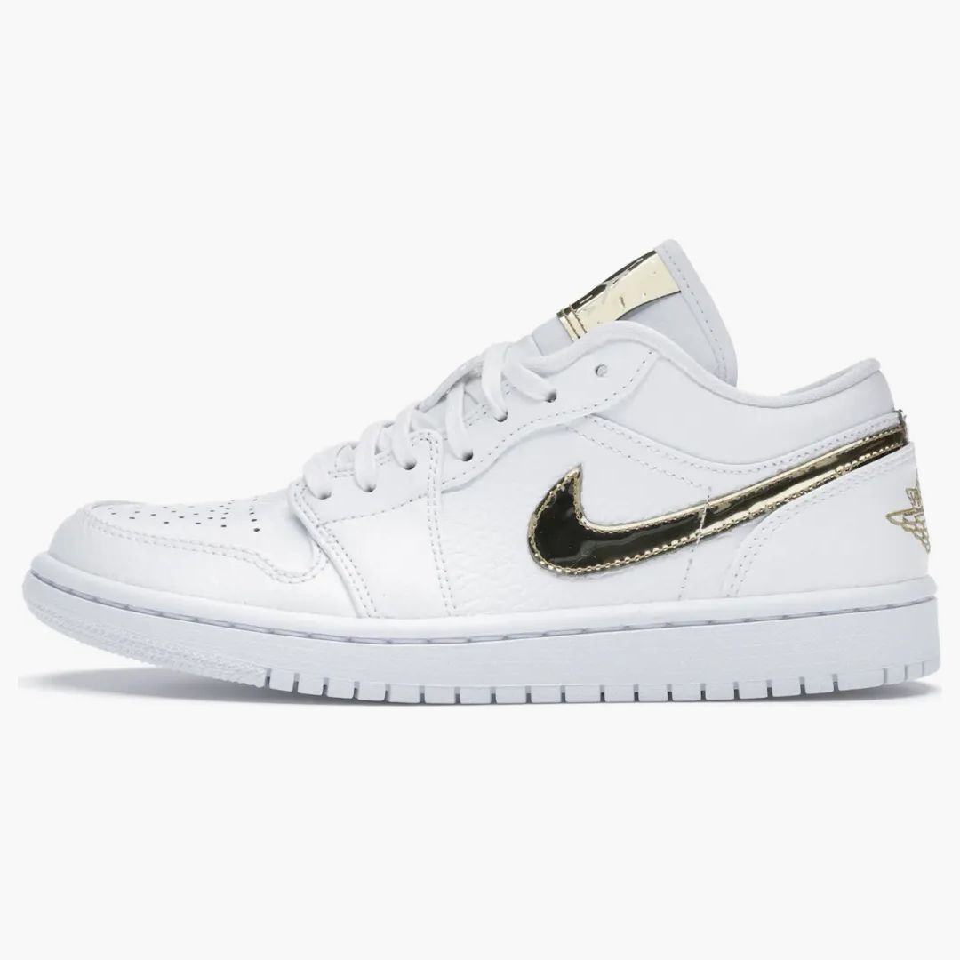 An elegant companion for fashion-conscious sneaker fans: the Jordan 1 Low White Metallic Gold for women combines classic coloring with modern accents. The white-gold look gives the sneaker a noble note, while the characteristic Nike Swoosh and the Jumpman Logo in shimmering gold provide striking highlights. The perforated toe area guarantees a pleasant air circulation, while the profiled sole offers optimal base liability. Since its market launch in September 2020, this sneaker not only inspires with its look, but also with its comfort.Authenticity Guaranteed
