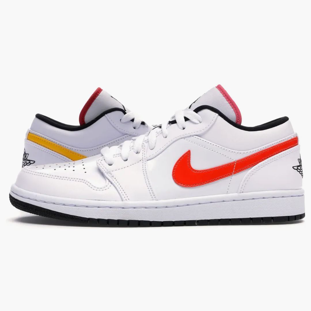 The Jordan 1 Low With his lively and versatile color combination, White Multi-Color attracts everyone's attention. The model convinces with a white leather upper material, supplemented by colorful accents that create a dynamic and unique look. Comfort is guaranteed by the padded shaft construction and the light foam sole. The robust rubber sole ensures stable grip. Special design elements like that Air Jordan Wings logo and the iconic Nike Swoosh make this model a must-have. The jumpman adorns the tongue and rounds off the stylish overall picture. Perfect for everyone who wants to enrich your everyday life with a stylish statement.Authenticity Guaranteed