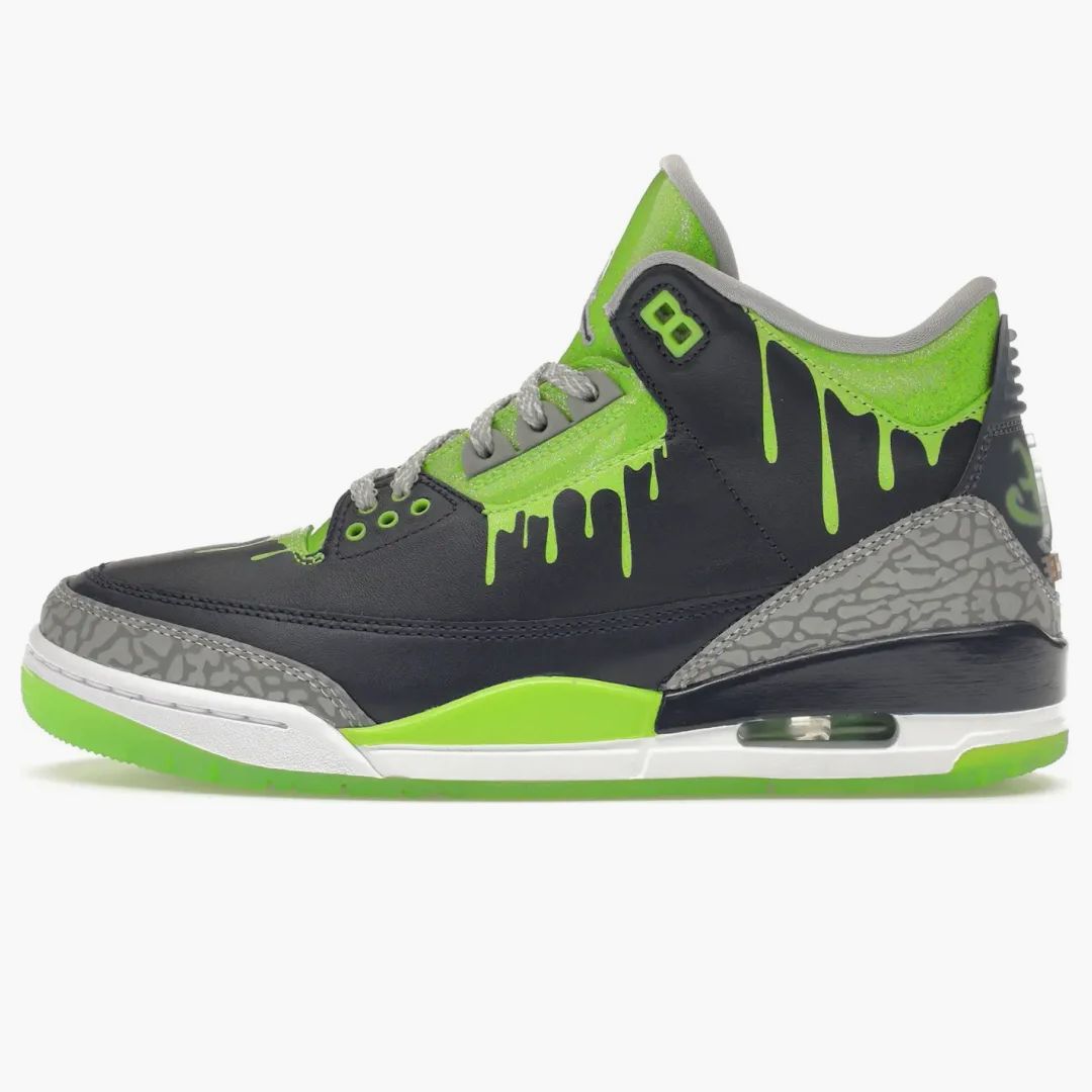 The Jordan 3 Retro Doernbecher Hugo brings a breath of fresh air to the sneaker world. Inspired by the Seattle Seahawks, the sneaker reflects the iconic team colors and impresses with a navy-colored leather design with gray elephant pattern overlays. A slime-green drip pattern also brings dynamics into play. The peculiarity of this edition: shining shoelaces and a transparent heel insert with Hugo's stylized emblem and his nickname 'Juice'. A clear eye-catcher is the 24-carat-gold slope day, which can also be worn individually as a trailer. The greenish outsole bears the motivating message "It's Ok to be different", which gives the shoe a unique character. A sneaker that not only shines optically, but also tells a story.Authenticity Guaranteed