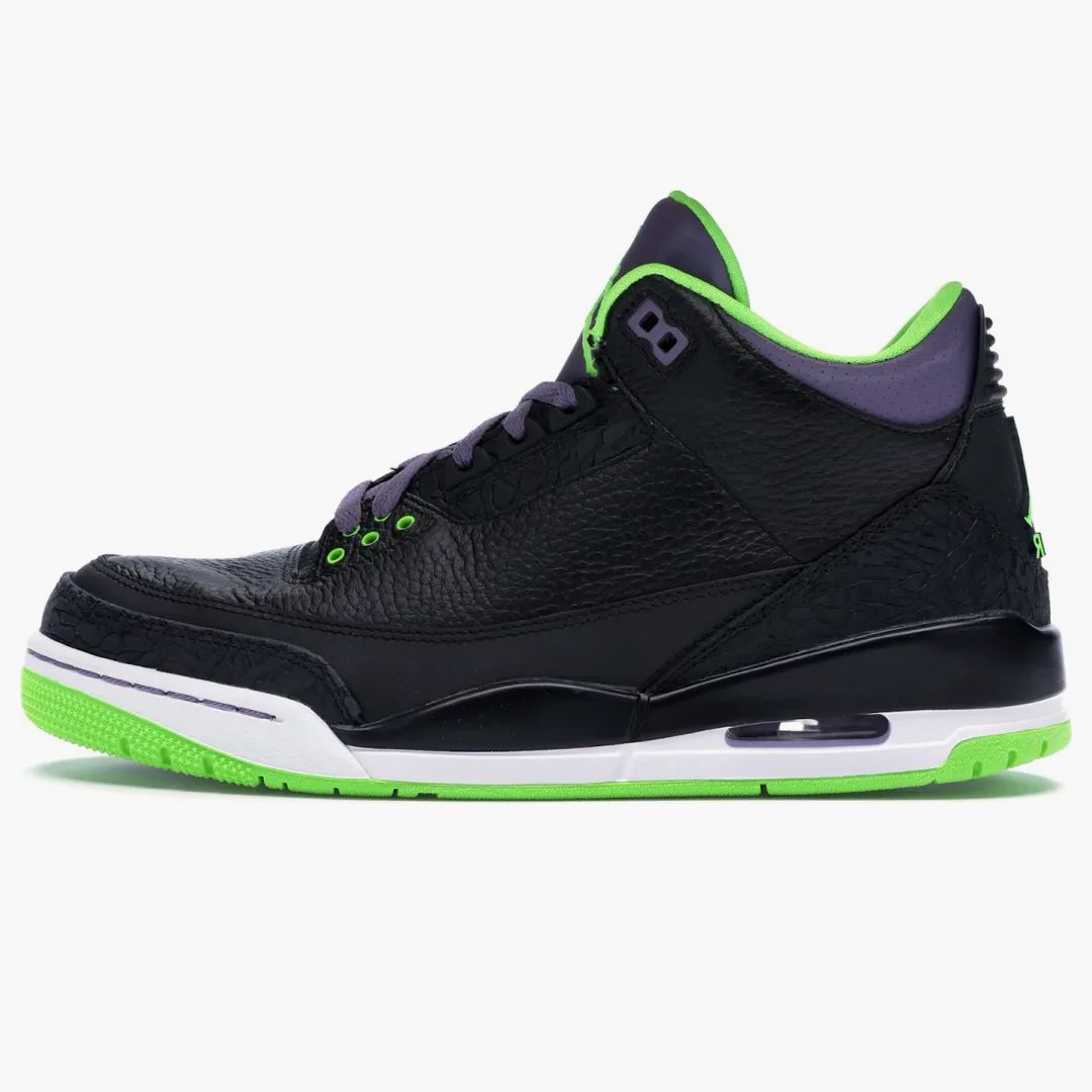 The Jordan 3 Retro 'Joker' in lively purple and neon green tones is a highlight for sneaker enthusiasts. Inspired by the iconic style elements that have made the model famous, this shoe presents itself as a modern classic. Originally designed by Tinker Hatfield, the Air Jordan 3 new standards in terms of comfort and style. With the introduction of the striking Jumpman logo and the groundbreaking Air Cushioning system, he changed the sneaker world. The 'Joker' was published in 2013 as part of the celebrations for the 25th anniversary of the model and still convinces with its unique coloring and extraordinary processing. A must for everyone who appreciates the merger of tradition and innovation.Authenticity Guaranteed