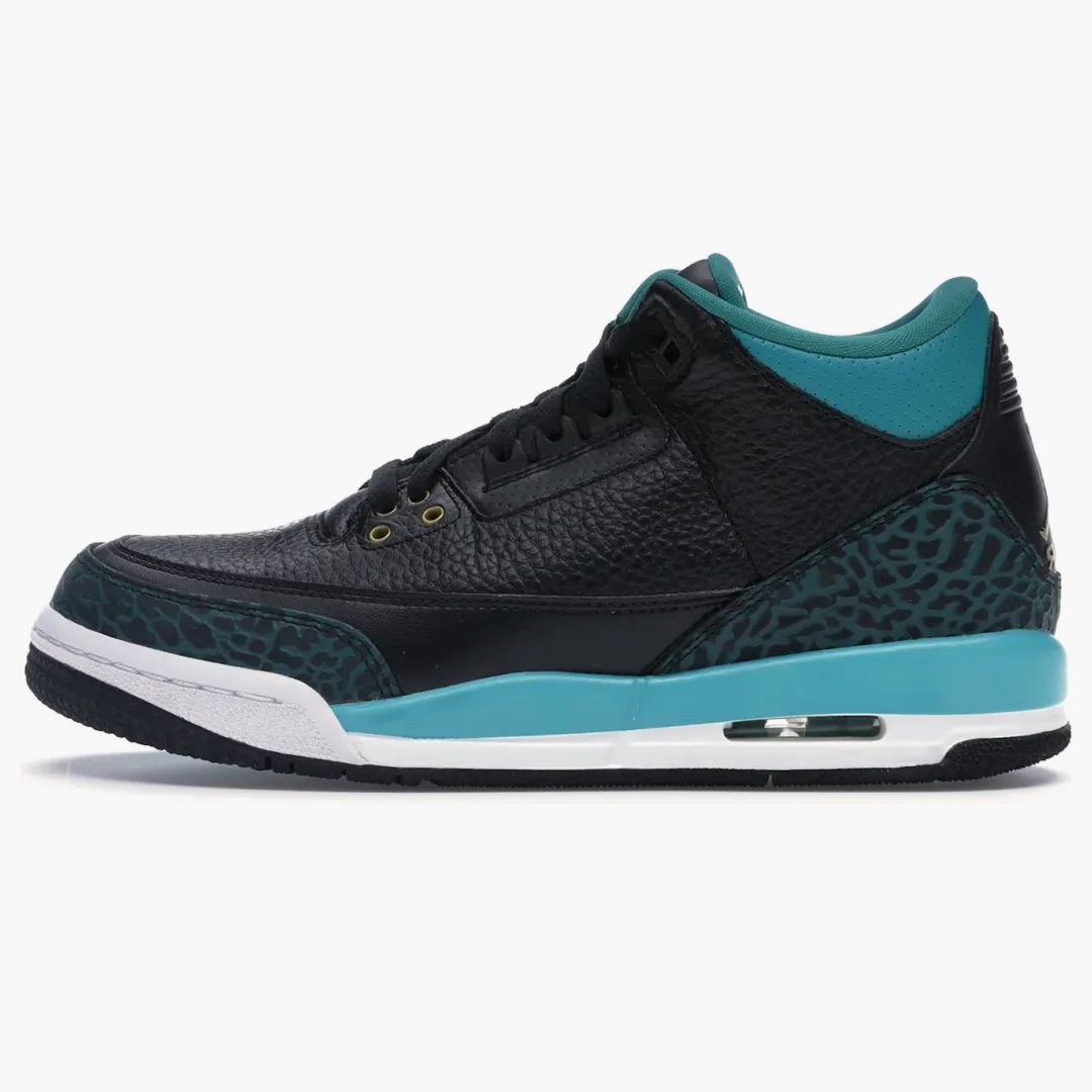 The Jordan 3 Retro Rio Teal (GS) presents itself as an exclusive sneaker for young fashion enthusiasts and scores with an appealing combination of black, metallic gold, Rio teal and white. The upper material made of luxurious, black leather stands out through a tumbled texture and is accentuated by fine, gold-colored accents on the iconic 'Jumpman' logos. A special highlight is the striking use of the Rio Teal in the classic elephant print, which gives the unique silhouette of the shoe a fresh look. With this special color shade of collar and midsole, an additional optical stimulus is created, which makes the aesthetics of the Jordan 3 unmistakable. A must-have that makes the classic shine in new splendor.Authenticity Guaranteed