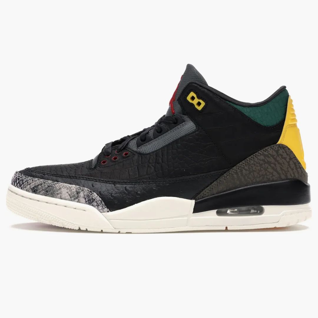 Unleash your wild style with the Jordan 3 Retro se animal instinct 2.0. These sneakers combine luxurious materials with functional design, inspired by the splendor of reptile -like textures. The upper impresses with noble, black crocodile leather, supplemented by snake and ostrich-like accents. Color highlights in green, yellow, red and gray set exciting accents and are in perfect harmony with the red Jumpman logo. A classic white sole and striking yellow heel elements complete this unique look. Published in June 2020, these sneakers not only offer comfort, but also a fashionable statement for everyone who loves something special.Authenticity Guaranteed