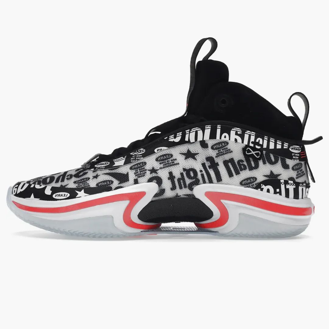 The Air Jordan 36 Flight School combines outstanding performance with a striking design. In his black and white look, decorated with modern graphics and 'Jordan Flight' typography, he is prominently emphasized by a striking infrared. This model offers seamlessly integrated zoom Air damping comfort, which guarantees a feather -light experience. The breathable mesh and the synthetic overlays ensure pleasant ease. In particular, the articulated Eclipse-Plate in the midfoot area inspires with careful pressure distribution and optimized movements. A shoe that not only impresses with functionality, but also gains the game in terms of style.Authenticity Guaranteed