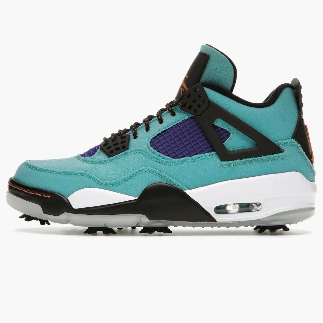 Experience the ultimate golf shoe with the Jordan 4 Retro Golf Us Open Torrey Pines Pack ACG. This exclusive sneaker combines functionality and style, perfect for every golf course. Made of flexible teal nylon, the shoe follows every movement. The striking purple grids give the design a lively note, while the trail laces in orange and black underline the outdoor look. A striking jumpman logo and hard-wearing black spikes on the sole complete this special golf shoe. On the market since June 2021, this shoe has been an investment in comfort and class.Authenticity Guaranteed
