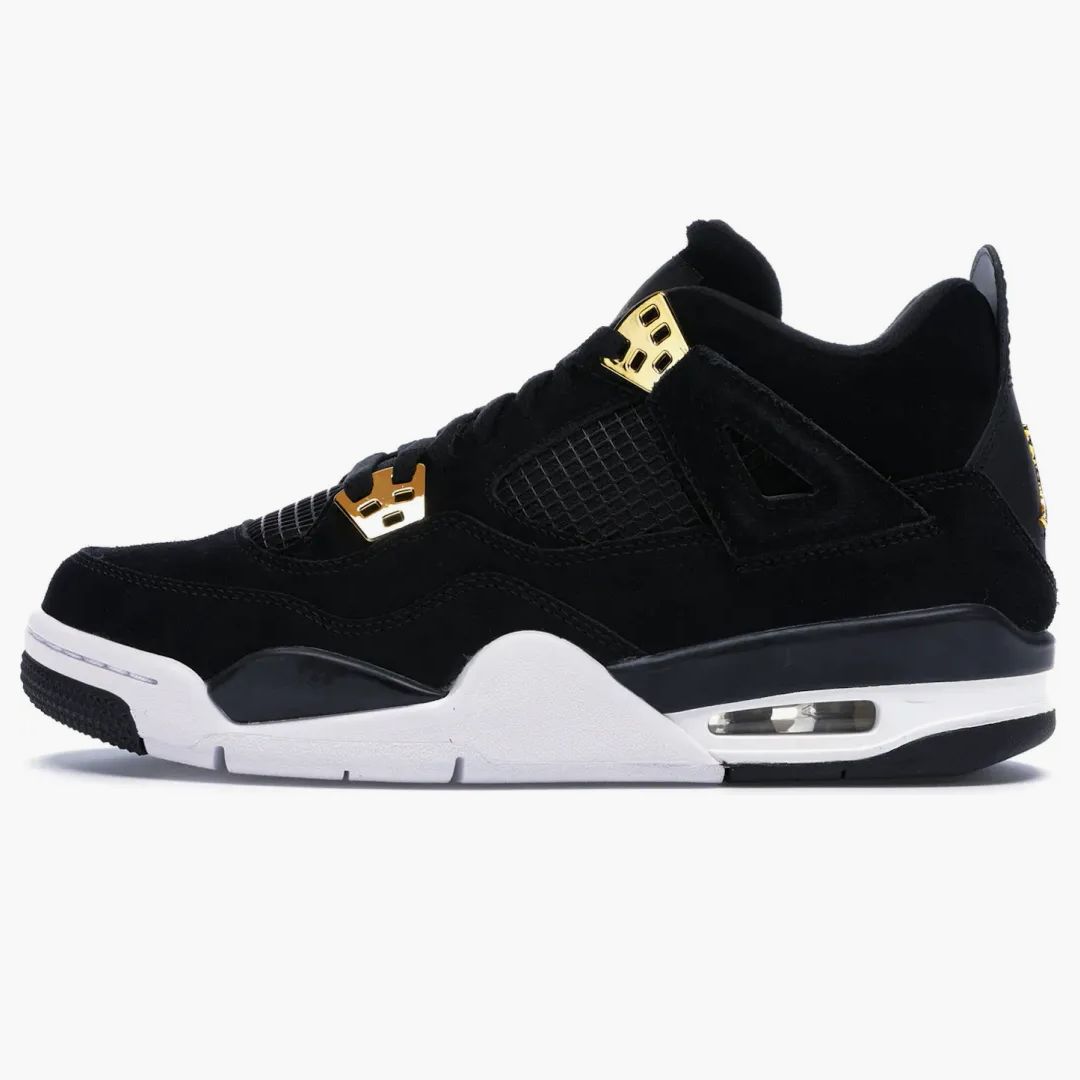 The Jordan 4 Retro Royalty (GS) impresses with a noble combination of black and metallic gold. This model for young sneaker fans scores with a high -quality upper made of Nubuk and suede, which is kept in deep black. Striking details such as the golden accents on the iconic logos and eyelets give the design a luxurious note. The white midsole not only offers a visual contrast, but also houses visible air cushions for first -class wearing comfort. The look is completed by a resistant sole with herringbone patterns, which promises optimal base liability. Since the release in February 2017, this sneaker has attracted everyone's attention.Authenticity Guaranteed