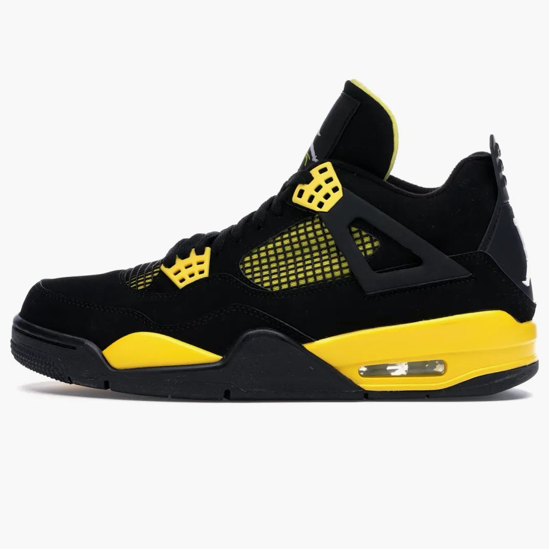 The Jordan 4 Retro Thunder from 2012 refreshed iconic shoes with a modern note. By combining suede, synthetic leather and rubber, you not only offer comfort, but also the noble look for which the brand is known. The high -contrast design in black and tour Yellow sets brave accents. The typical jumpman silhouette adorns both the heel and the tongue, accompanied by the striking air element in the sole for additional comfort. Rounded off by the characteristic orange Jordan Hangtag, this sneaker promises a stir at every step. A timeless classic that celebrated its premiere on December 22, 2012.Authenticity Guaranteed