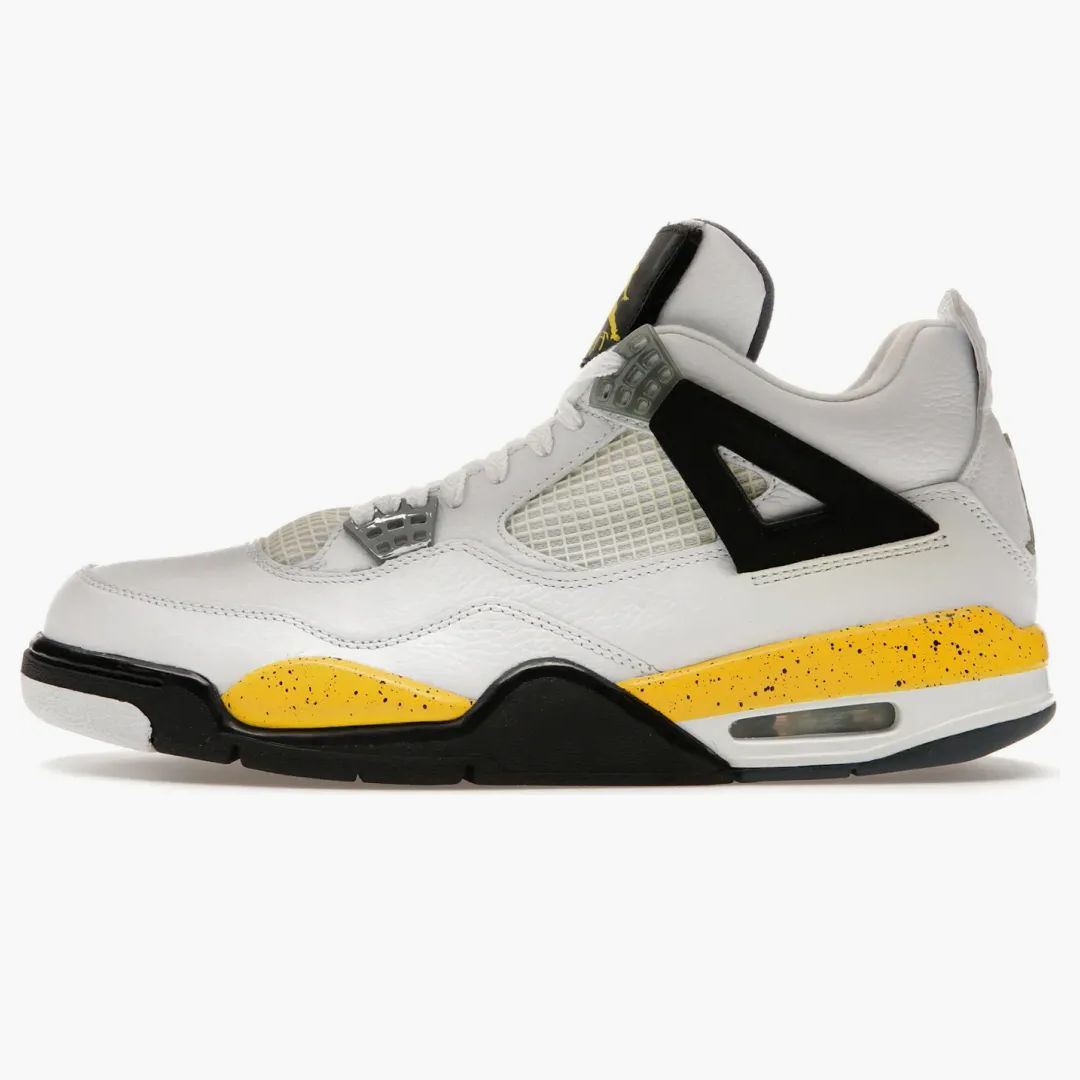 The Jordan 4 Retro Tour Yellow / Rare Air is a stylish sneaker designed by Tinker Hatfield and convinces with a removable tongue patch. The model skilfully combines white mesh inserts with elegant leather overlays and relies on striking black 'wings' that complete the look. A special eye -catcher is the speckled yellow midsole, which brings color into the design and draws attention to itself. A tour Yellow Jumpman logo and transparent air elements complete the design. Published for the first time in May 2006, this sneaker is a must for all fans of legendary sports styles.Authenticity Guaranteed