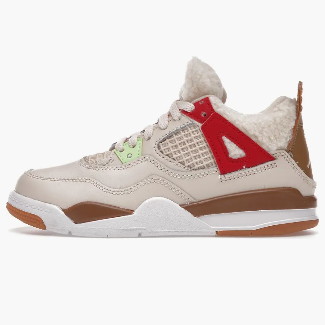 Entdecken Sie den Jordan 4 Retro 'Where The Wild Things Are', der mit seinem spielerischen Design begeistert. Diese Sneaker vereinen eine klassische Struktur mit einer einzigartigen Hommage an das beliebte Kinderbuch. Das Obermaterial aus Leder in Perlweiß und Dunkelholz harmoniert perfekt mit lebendigen Farbakzenten in Rot, Grün, Blau und Rosa. Der plüschige Kragen und die Zunge erinnern an das Fell der fantasievollen Monster des Buches, während dezente braune Elemente die Geschichte weitererzählen. Der ikonische Jumpman auf Zunge und Ferse rundet dieses besondere Modell ab. Sichern Sie sich ein Stück Kindheitserinnerung mit Stil.Authenticity Guaranteed