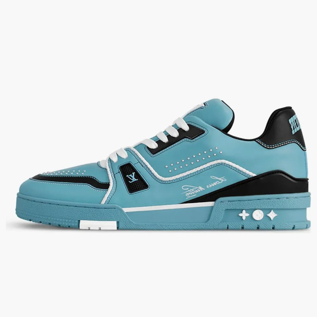 The Louis Vuitton LV trainer in the fascinating color combination 'Teal Blue Black' combines timeless elegance with urban flair. Inspired by classic basketball design, this sneaker streetwear lifts to a new level. Every detail reflects the incomparable craftsmanship for which the Louis Vuitton brand is known. The precise workmanship and the striking style make this shoe an indispensable addition to any high-quality sneaker collection. Enjoy the comfort and the exclusive look that gives every outfit that certain something.Authenticity Guaranteed