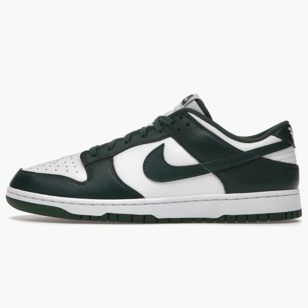 The Nike Dunk Low Michigan State combines classic elegance with sporty flair. The combination of high -quality white leather and striking green covering promises a timeless look. The retro logos on the tongue and the embroidery on the heel are a tribute to the original dunks from 1985 and give the shoe a touch of nostalgia. Publication 2021 and a new publication 2024 testify to its ongoing popularity. A must-have for sneaker enthusiasts who value style and history.Authenticity Guaranteed
