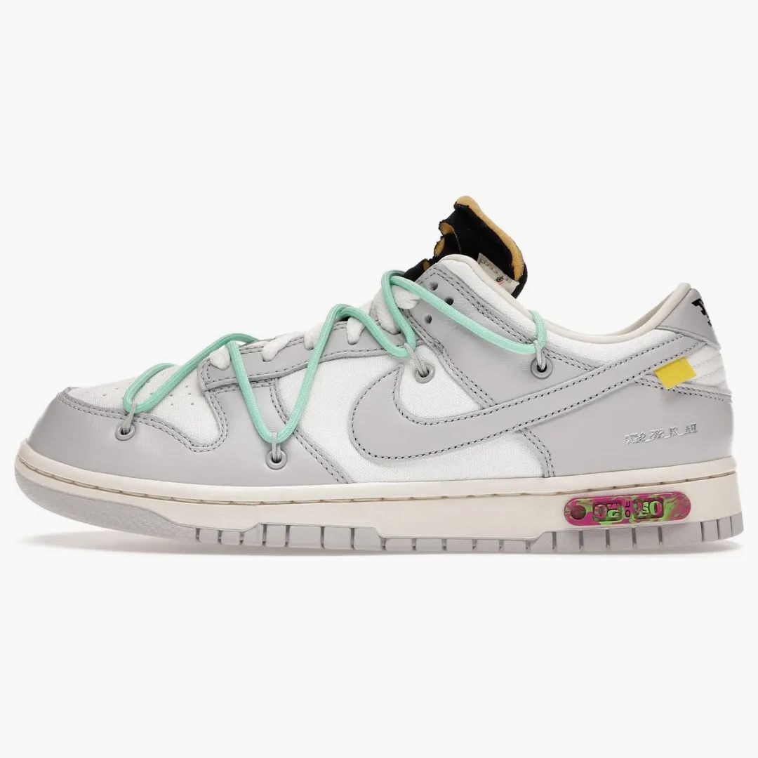 The Nike Dunk Low Off-White Lot 4 combine the best of Nike and the creative vision of Virgil Abloh. This special sneaker presents itself in a noble combination of sail leather and green accents that ensure a refined look. Both the transparent details and the visibly exposed foam on the tongue give you that certain something. Perfect for everyone who appreciates high wearing comfort, they offer a padded inside and a gray rubber sole for solid traction. The design is rounded off with characteristic brand logos. The shining shoe straps in particular give the model its unmistakable character. A must-have that has been enthusiastic about sneaker lovers since August 2021.Authenticity Guaranteed