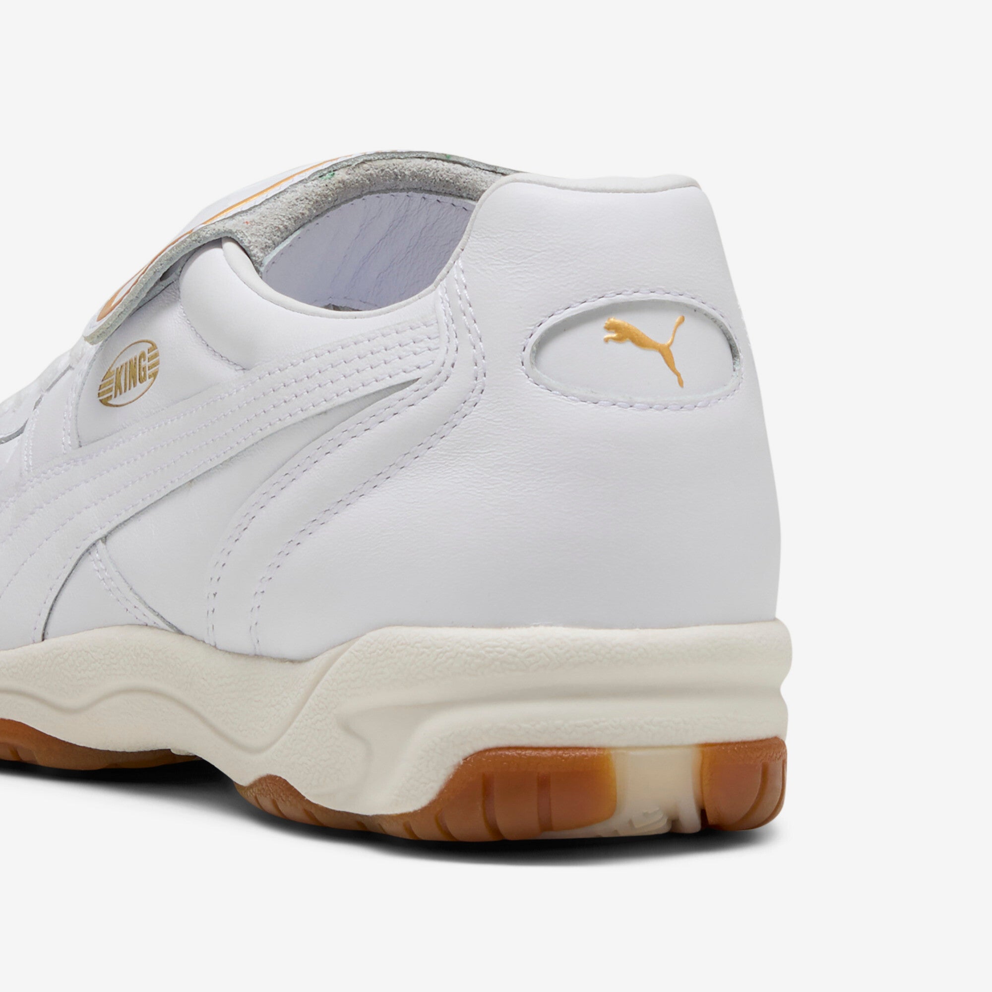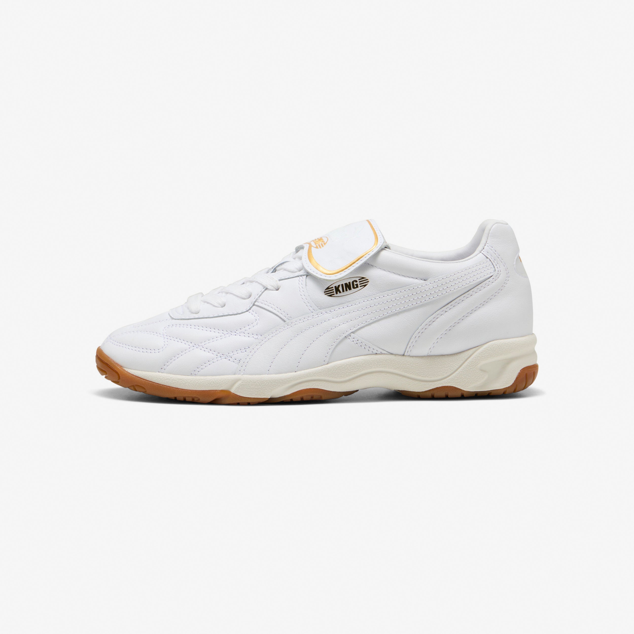 PUMA dives into its deep archives once again to reintroduce a true Futsal icon, the King Indoor. After making its first appearance in 1999, the PUMA King Indoor transcended the world of street cages and indoor courts with its premium leather upper, flat woven laces, cutout lace holder, and durable rubber sole, while the football-inspired deco stitching throughout the upper and fold-over tongue round off the classic design alongside gold foiled PUMA logos.