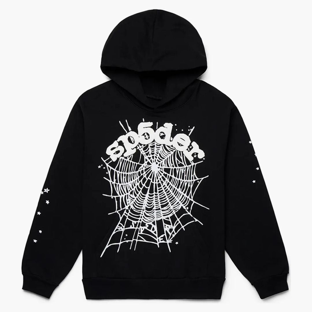 The SP5DER OG Web Hoodie Black combines the urban charm of a streetwear mark with unbeatable wearing comfort. In a classic black, a striking lettering is presented on the front, which tastefully spans over the chest. Among this is a fascinating web design with small, sparkling stars that give the overall look a special touch. An artistically integrated brand name cleverly attracts everyone's attention. The left sleeve area also adorns a striking star pattern, while the back is in a simple black. Since its market launch in January 2024, this hoodie has become an Essentials piece of every style-conscious cloakroom.Authenticity Guaranteed