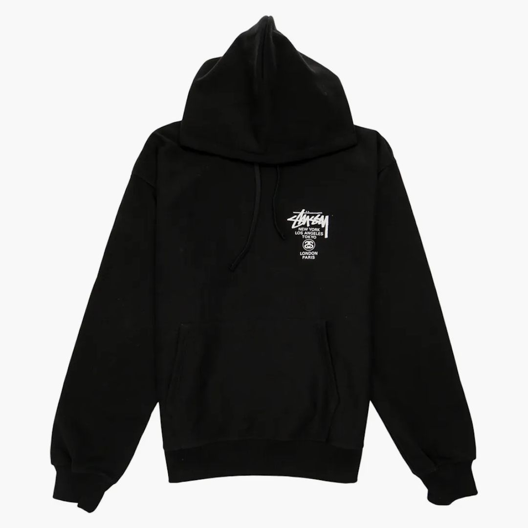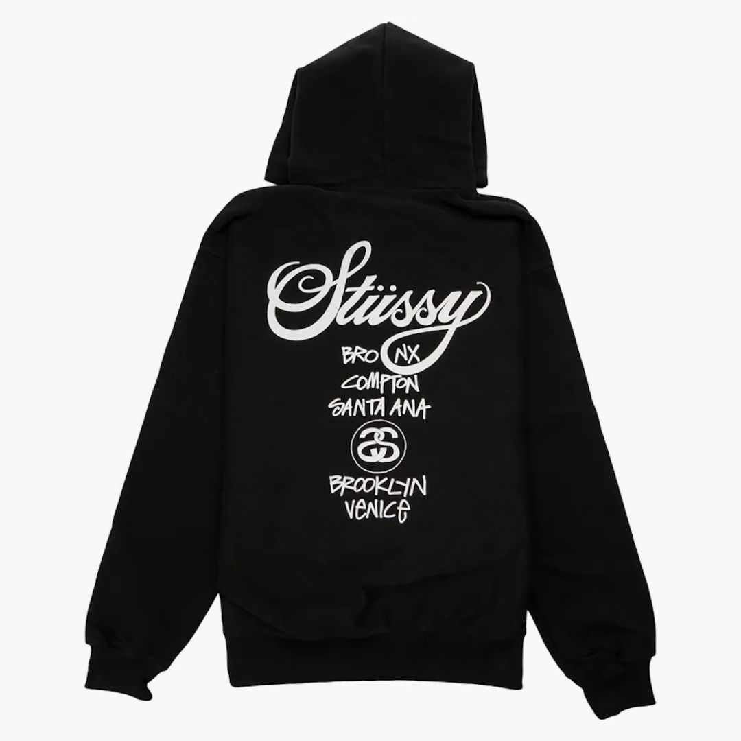 The Stussy World Tour Hoodie in Schwarz is a true masterpiece of the Urban Styles. With its classic design in deep black and the iconic, white lettering on the front and back, he honors the fashion metropolises of our world. The detailed manufacture shows the high -quality mix of materials made of 90% cotton and 10% polyester, which ensures comfort and durability. The hood train is cleverly provided with metalous and cordel ends. On the front is the characteristic, handwritten logo of Stussy, surrounded by names such as Paris, London and Tokyo, which underline the urban flair. This piece of clothing is part of the permanent collection and thus embodies the essence of timeless streetwear.Authenticity Guaranteed
