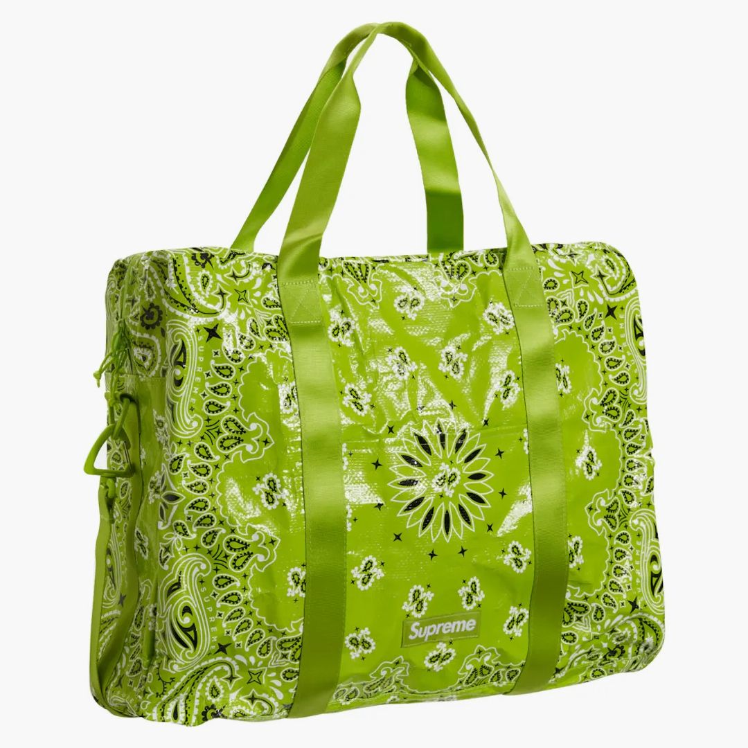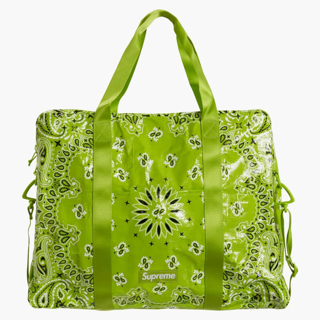 The Supreme Bandana Tarp Large Duffle Bag in Bright Green is the perfect companion for every occasion. This bag captivates with its iconic bandana design and the strree-typical streetwear charm. Made made of durable material, it offers enough space for everything you need on the go. The generous size and robust handles make you ideal for travel or daily use. A must-have for everyone who wants to combine functionality with a touch of style. This Duffle BAG embodies the best of urban design, combines with the distinctive quality of Supreme.Authenticity Guaranteed