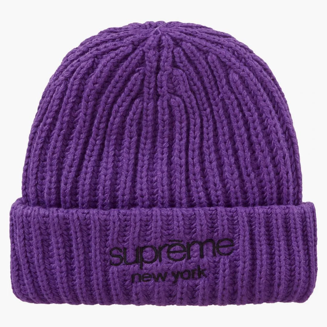 Discover the distinctive supreme style with the Classic Logo Chunky Ribbed Beanie in a striking purple. This accessory combines urban streetwear charm with high-quality knitting art. The soft, robust processing not only guarantees optimal comfort, but also a long service life. A embroidered logo on the front gives the hat the iconic look, which supplements every style - be it when strolling in the city relaxed or as a fashionable statement at low temperatures. A must for everyone who value quality and design.Authenticity Guaranteed