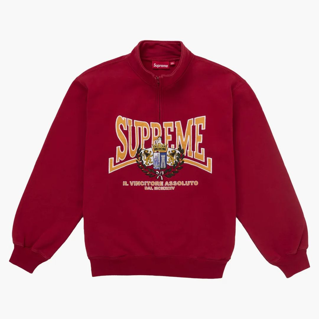 Ein Hauch von Streetwear-Ikone erwartet dich mit dem Supreme Crest Applique Half Zip Pullover in Rot. Bekannt für seine unvergleichliche Qualität und modische Innovation, bringt dieser Pullover Stil und Komfort in eine perfekte Harmonie. Das halbhohe Reißverschlussdesign sorgt für vielseitige Tragbarkeit, während die ikonischen Applikationen designt sind, um Bindungen zwischen Tradition und Moderne zu schaffen. An kühlere Tage gedacht, ist sein lebendiges Rot ein echter Hingucker, ideal für jedes urbane Abenteuer. Entdecke mit Supreme die Essenz von zeitlosem Design und topaktueller Fashion.Authenticity Guaranteed