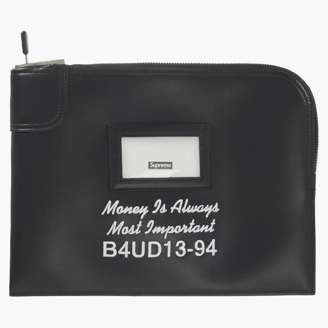 The Supreme Money Bag Black is a perfect accessory for all those who value style and functionality. Made from high -quality leather, this money pocket offers both durability and a noble look. The subtle black color gives it a timeless elegance that fits every outfit. Ideal for daily use, it offers enough space for cards and cash. A must-have for everyone who wants to combine quality and design in their everyday life. Expand your collection with this elegant piece from Supreme.Authenticity Guaranteed