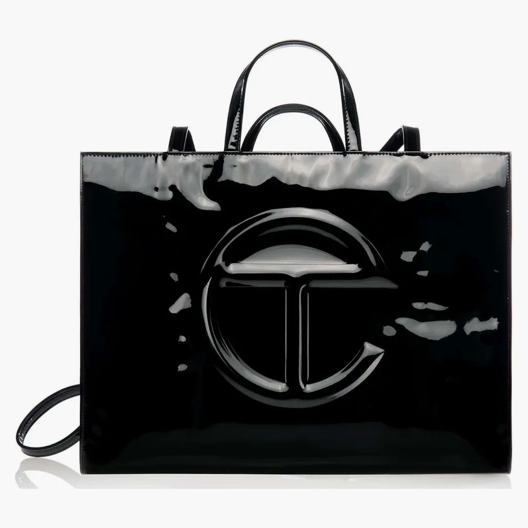 This Telfar Large Patent Shopping Bag in elegant black convinces with its generous size and its high -gloss finish. The practical companion is ideal for everyday settings or extensive shopping trips. A dust bag in the scope of delivery ensures optimal protection instead of a bulky box. The subtle brand embossing on the front gives the bag a subtle but unmistakable look. Telfar stands for modern designs that are both stylish and functional, and this bag is a perfect example of this philosophy. Perfect for everyone who value quality and stylish details.Authenticity Guaranteed